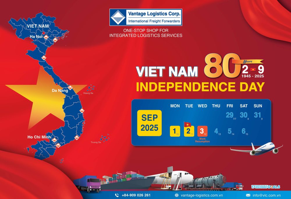 Should you need any assistance during the holiday, please don’t hesitate to reach out to us at info@vlc.com.vn — we will respond as soon as possible. National Day, 2 September, is not only a holiday but also a historic milestone reminding generations of Vietnamese people of the journey to independence, freedom, and the sacred love for our homeland. 2025 marks the 80th anniversary of Vietnam’s National Day on 2nd September –  a proud milestone in the nation’s journey toward independence and self-determination. Eight decades have passed, yet the spirit of resilience and unity continues to shine, instilling national pride and inspiring the determination of today’s Vietnamese people to reach greater heights. On this meaningful occasion, Vantage Logistics would like to announce our 2025 Independence Day holiday schedule as follows: Holiday: 1st September – 2nd September 2025  (Monday to Tuesday) Resume work: 3rd September 2025 (Wednesday) National Day Holiday (1 – 2 September 2025), Vantage Logistics will resume operations on 3 September 2025 Due to the holiday, there may be a short delay in responses, but rest assured – we’ll respond as soon as possible! Hotline: +84-909-026-261 Email: info@vlc.com.vn On this special occasion, Vantage Logistics extends its warmest wishes to our valued customers, partners, and colleagues across the industry. May this National Day holiday be filled with meaning – a time to reflect on our nation’s historic journey, celebrate its proud legacy, and share in the joy of this remarkable milestone!...