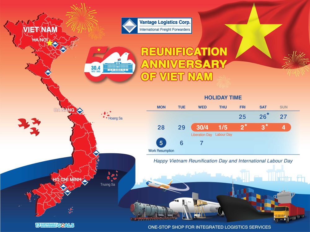On this meaningful occasion, Vantage Logistics would like to announce our 2025 holiday schedule for Reunification Day and International Workers’ Day as follows: