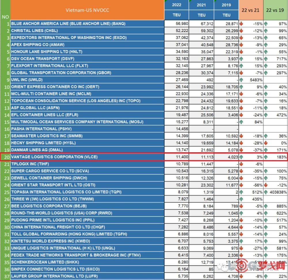 In 2022, Vantage is top 1 of local freight forwarder about Volume from Vietnam to USA