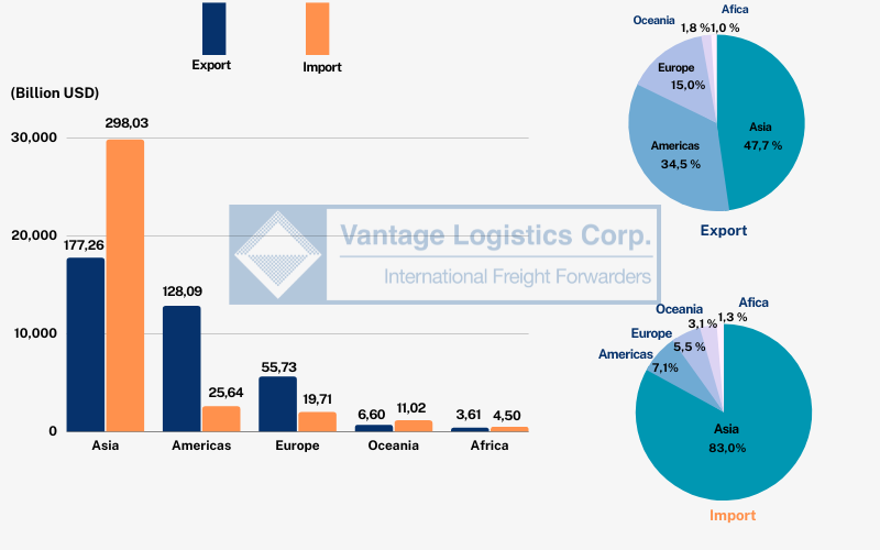 In 2022, Vietnam’s merchandise trade with Asia will reach 475,29 billion USD, up 9,6% compared to 2021, continuing to account for the highest proportion (65,1%) in the total value—import and export of the country. 1.      Overview: In 2022, the total import-export value of Vietnam’s goods reached 730,2 billion USD, up 9,1% (equivalent to 61.2 billion USD) compared to 2021. The export value is 371,3 billion USD, up 10,5%, corresponding to 35,14 billion USD increase over the previous year; import value was 358,9 billion USD, up 7,8%, equivalent to 26,06 billion USD. The balance of trade in goods for the whole year 2022 reached 12,4 billion USD, The General Department of Customs recorded the total import and export value of foreign direct investment (FDI) enterprises in 2022 to USD 506.83 billion, up 9,3% (equivalent to USD 43,22 billion) compared to 2021. The export of goods of FDI enterprises in 2022 of FDI enterprises to USD 273,63 billion, an increase of 11,6% (equivalent to an increase of USD 28,5 billion) compared to 2021. It accounted for 73,7 % of total export value of the country. 2.       Import-Export Market In 2022, Vietnam’s merchandise trade with Asia reached 475,29 billion USD, up 9.,% compared to 2021, continuing to account for the highest proportion (65,1%) in the total value—import and export of the country. The import-export value between Vietnam and other continents is respectively: the Americas: 153,73 billion USD, up 10,5%; Europe: 75,45 billion USD, up 2,8%; Oceania: 17,62 billion USD, up 24,3% and Africa: 8,1 billion USD, down 3,9% compared to 2021. Chart 1: Import and export value by continent, country and some major markets in 2022 – Source: General Department of Customs 3.       ExportIn 2022, the total export value of Vietnam reached 371.3 billion USD, up 10.5%, corresponding to 35,14 billion USD increase over the previous year. Which, other machinery, equipment, tools, and spare parts increased by 7,43 billion USD; footwear of all kinds increased by 6,15 billion USD; textiles and garments increased by 4,82 billion USD; computers, electronic products, and components increased by 4,74 billion USD; seafood increased by 2,04 billion USD. Chart 2: Top 10 export groups of Vietnam in 2022 – Source: General Department of Customs Some main export commodity groups:– Phones and accessories: For the whole year of 2022, the export of phones and accessories of all kinds and components reached USD 57.99 billion, up 0.8% compared to 2021. In this group of goods exported to the Chinese market reached 16.26 billion USD, up 7.1%; to the US market with a value of 11,88 billion USD, up 22,5%; to the EU reached 6,7 billion USD, down 15,1%; to Korea reached 5,05 billion USD, up 5,3%… compared to the previous year. – Computers, electronic products & components: exports of computers, electronic products, and components to the US reached 15,94 billion USD, up 25% over the previous year; to the Chinese market reached 11,88 billion USD, up 7,3%; to the EU market reached 6,87 billion USD, up 4,7%; to Hong Kong market reached 5,88 billion USD, down 6,7%; to the Korean market reached 3,38 billion USD, down 3,1%… – Machinery, equipment, tools and spare parts: The main export markets of this group of goods are: the US with 20,18 billion USD, up 13,3%; EU reached 5,76 billion USD, up 32,2%; China reached 3,68 billion USD, up 28,3%; Japan reached 2,76 billion USD, up 7,6%; Korea reached 2,73 billion USD, up 7%… compared to 2021. – Textiles and Sewing: In the past year, exports of textiles and garments to the US market reached 17,36 billion USD, up 7,9%; to the EU reached 4,46 billion USD, up 34,7%; Japan reached 4,07 billion USD, up 25,8%; Korea reached 3,31 billion USD, up 12,1%… compared to 2021 – Footwear of all kinds: Export of all kinds of footwear to key markets in 2022 increased sharply. Specifically, exports to key markets such as the United States reached 9,62 billion USD, up 29.6%; EU reached 5,91 billion USD, up 45,3%; China reached 1,71 billion USD, up 7,3%… over the previous year. – Wood and wood products: In the past year, the export of wood and wood products to the US market reached 8,66 billion USD, down 1,3%; to China reached 2,15 billion USD, up 43,8% and Japan reached 1,89 billion USD, up 31,4%… over the previous year. – Seafood products: In the past year, seafood export value to the US reached 2,13 billion USD, up 4% (equivalent to 82 million USD); Japan reached 1,71 billion USD, up 29% (equivalent to 381 million USD); China reached 1,57 billion USD, up 61% (equivalent to 598 million USD) and the EU reached 1,3 billion USD, up 21% (equivalent to 228 million USD) over the previous year. – Iron and steel of all kinds: compared with the previous year, the amount of iron and steel exported in 2022 only reached 8,4 million tons with a value of 7,99 billion USD, down 35,9% in volume and 32,2% in quantity value (equivalent to a decrease of USD 3,8 billion). The amount of iron and steel exports in 2022 is mainly to the following markets: ASEAN with 3.55 million tons, down 7.1%; EU with 1.55 million tons, down 15%; United States with 682 thousand tons, down 35%… compared to the previous year. In particular, the export volume of iron and steel of all kinds to the Chinese market was only 99,2 thousand tons, while the number of exports to this market last year was up to 2,63 million tons. 4. Import The total import value of Vietnam’s goods in 2022 reached 358,9 billion USD, up 7,8% compared to 2021. In which, the biggest increase was in computers, electronic products, and components, up 6,33 billion USD, corresponding to an increase of 8,4%; petrol and oil of all kinds increased by 4,86 billion USD, equivalent to an increase of 118,5%; chemicals increased by 1,5 billion USD, corresponding to an increase of 19,6%; coal increased by 2,69 billion USD, equivalent to 60,2%; crude oil increased by 2,61 billion US