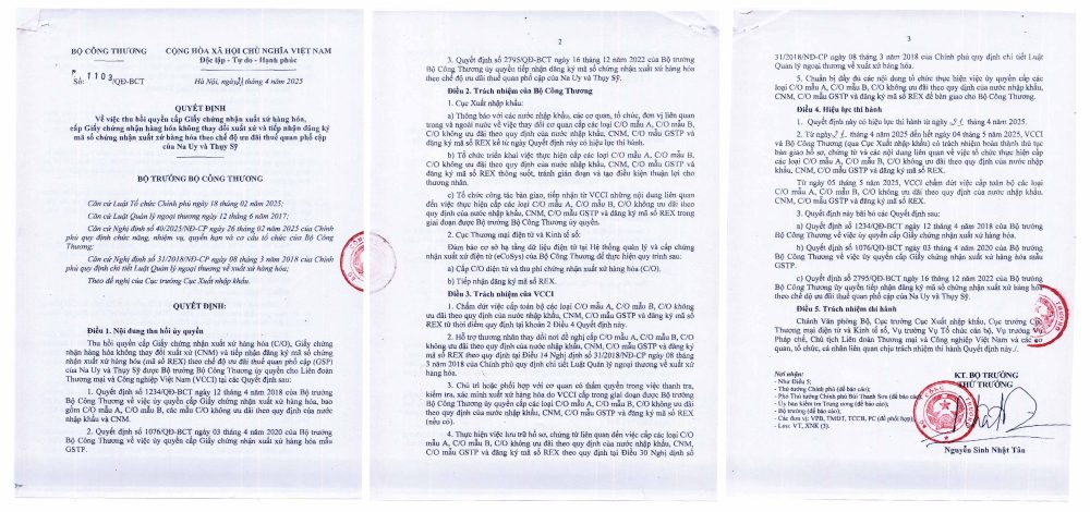 According to Decision 1103/QD-BCT, the Ministry of Industry and Trade has revoked a series of previous authorization decisions for VCCI, including the right to issue C/O forms A, B, non-preferential, CNM, C/O form GSTP and receive REX codes under the GSP of Norway and Switzerland. From April 21, 2025, enterprises will no longer submit application documents for issuance of documents through VCCI, instead, they need to carry out all procedures through the eCoSys system of the Ministry of Industry and Trade.