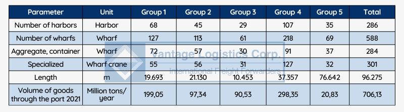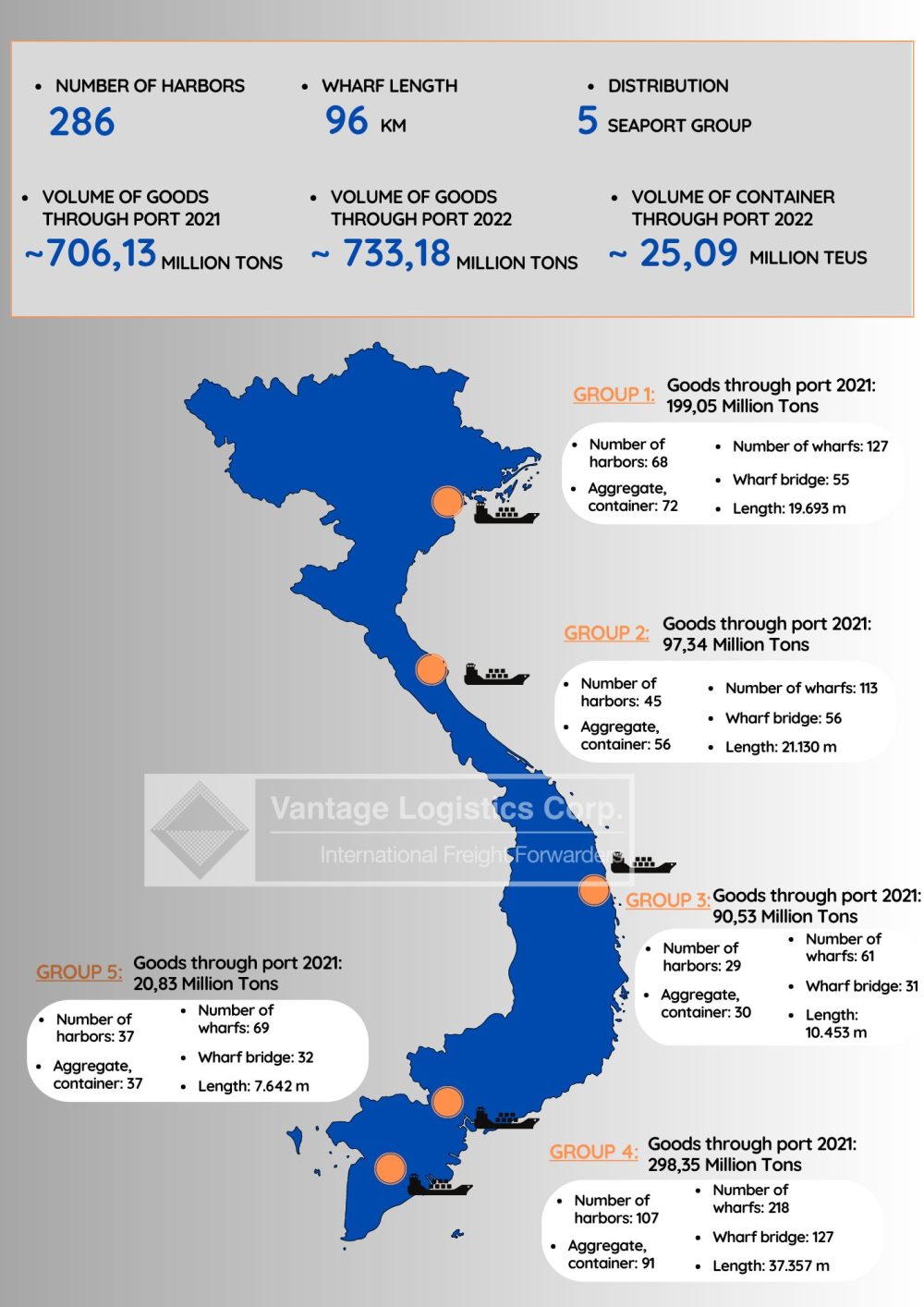 As of June 2022, Vietnam’s seaport system currently has 286 ports, distributed in 5 groups of seaports, with a total length of more than 96 km, and infrastructure to meet the throughput of more than 706 million tons per year in 2021. Established gateway ports combining international transshipment in the North and the South; successfully received container ships up to 132,000 DWT at Lach Huyen Wharf (Hai Phong), up to 214,000 DWT at Cai Mep Wharf (Ba Ria – Vung Tau).