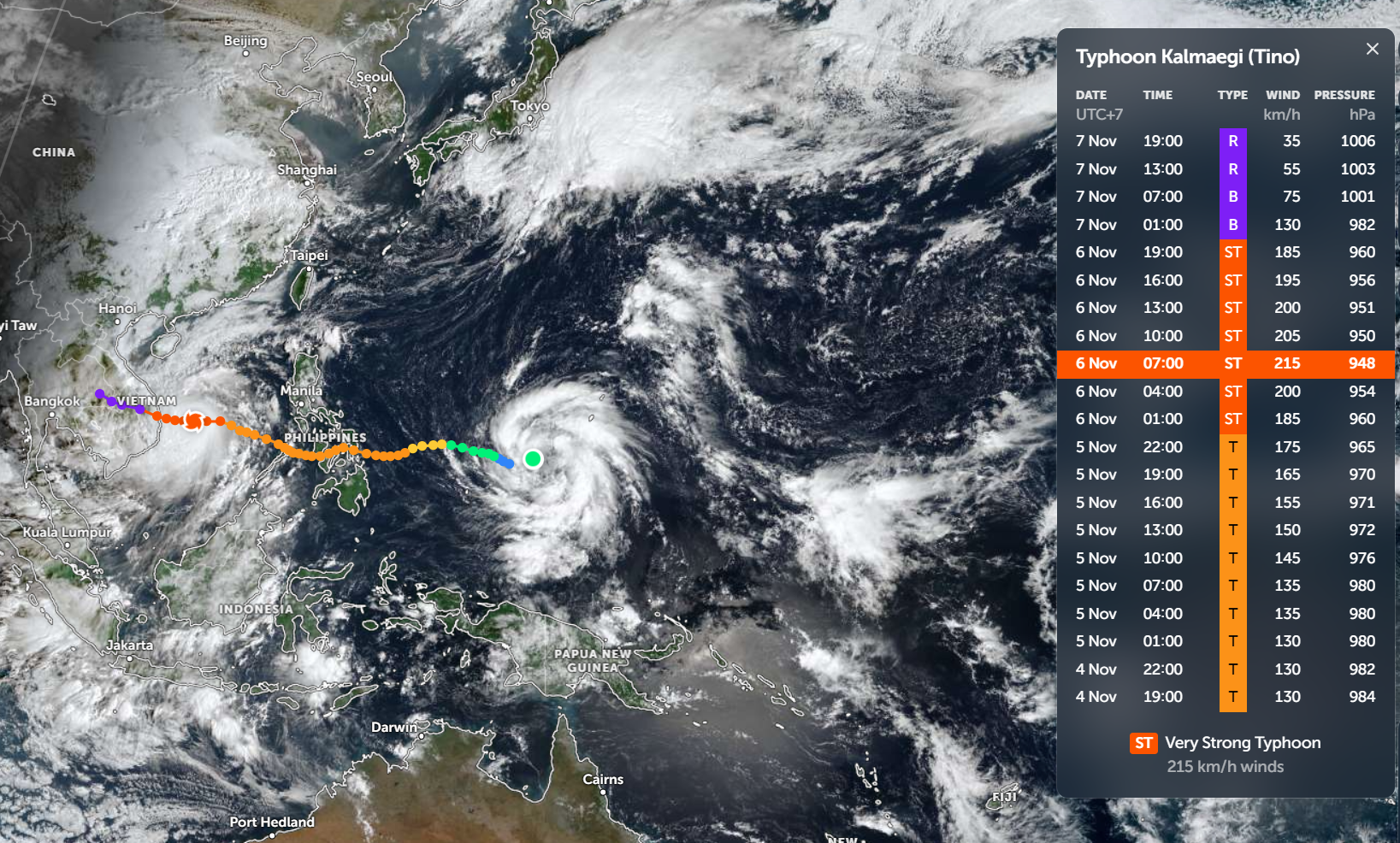 Ảnh vệ tinh bão Kalmaegi trên vùng biển Tây Thái Bình Dương, tháng 11/2025. Nguồn: Zoom Earth
