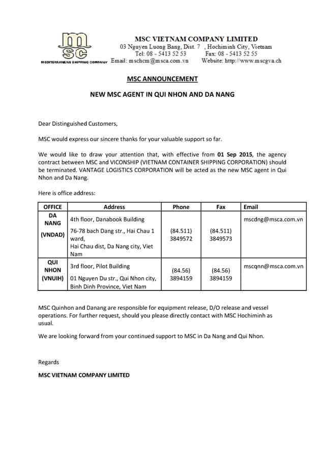 We have the honour to announce that MSC Vietnam officially assigned Vantage Logistics Corporation to be their agent in Da Nang and Qui Nhon port with effect from 1 September 2015. This is a chance, and also a big challenge to our team to create and contribute our value to MSC, as well as our valueable partners, clients.